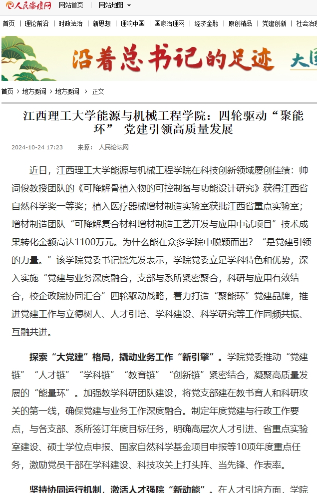 能源与机械工程学院在科技创新领域屡创佳绩:帅词俊教授团队的《可降解骨植入物的可控制备与功能设计研究》获得江西省自然科学奖一等奖;植入医疗器械增材制造实验室获批江西省重点实验室;增材制造团队“可降解复合材料增材制造工艺开发与应用中试项目”技术成果转化金额高达1100万元。为什么能在众多学院中脱颖而出?“是党建引领的力量。”该学院党委书记饶先发表示,学院党委立足学科特色和优势,深入实施“党建与业务深度融合,支部与系所紧密聚合,科研与应用有效结合,校企政院协同汇合”四轮驱动战略,着力打造“聚能环”党建品牌,推进党建工作与立德树人、人才引培、学科建设、科学研究等工作同频共振、互融共进。