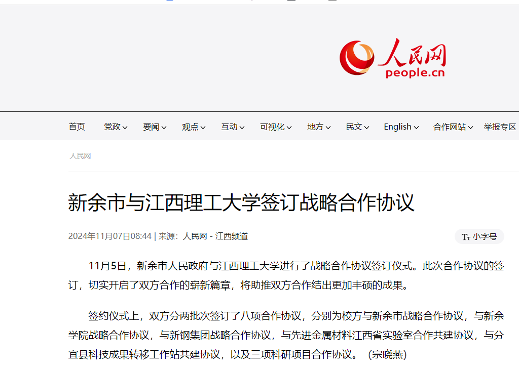 签约仪式上,双方分两批次签订了八项合作协议,分别为校方与新余市战略合作协议,与新余学院战略合作协议,与新钢集团战略合作协议,与先进金属材料江西省实验室合作共建协议,与分宜县科技成果转移工作站共建协议,以及三项科研项目合作协议。(宗晓燕)