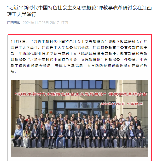 马克思主义学院承办。来自教育部“习近平新时代中国特色社会主义思想概论”分教指委专家、江西省委教育工委宣传部领导、江西省“习近平新时代中国特色社会主义思想概论”分教指委专家、思政课教学和科研专家、全国高校思政课教学展示活动获奖者代表共100余人参加此次教学改革研讨会。