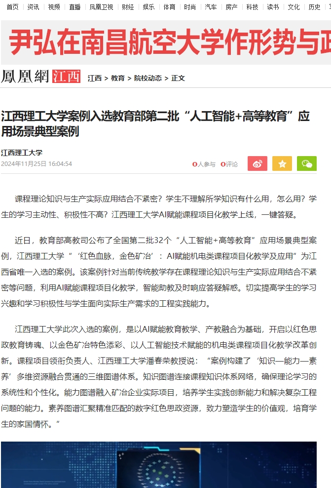 “‘红色血脉,金色矿冶’:AI赋能机电类课程项目化教学及应用”为江西省唯一入选的案例。该案例针对当前传统教学存在课程理论知识与生产实际应用结合不紧密等问题,利用AI赋能课程项目化教学,智能助教及时响应答疑解惑。切实提高学生的学习兴趣和学习积极性与学生面向实际生产需求的工程实践能力。