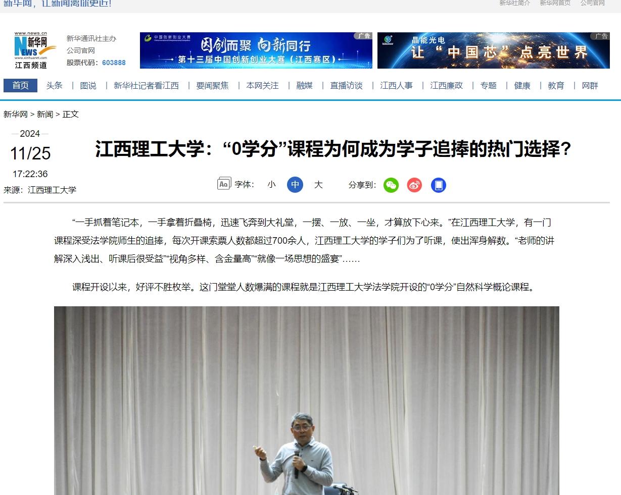 “与其他的专业课不同,‘自然科学概论’课程更像是不定期的名家荟萃系列讲座。围绕共同的主题,每位老师发挥所长,不同角度呈现对学科的理解。无论是从自然科学发展的宏观视野,还是从技术科学、工程科学等相对微观的视域。每位老师的授课内容都让我印象深刻、收获颇丰。”法学院2022级本科生邱康宁说道。