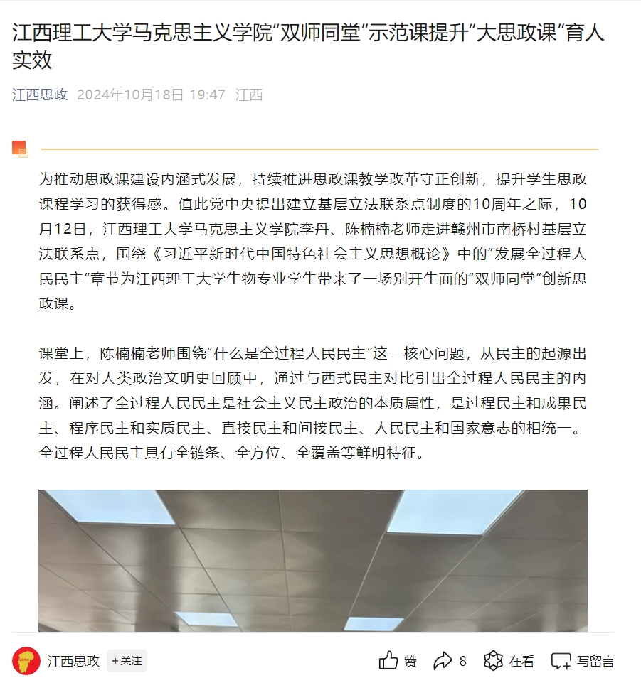 全过程人民民主是中国民主理论创新、制度创新和实践创新的时代结晶,拓展了社会主义民主政治的理论和实践内涵,丰富了人类政治文明形态。经过这堂生动的“双师同堂”思政课,同学们纷纷表示受益匪浅,作为新时代的接班人,要努力学习民主知识,提高政治素养,担当起民族复兴大任。