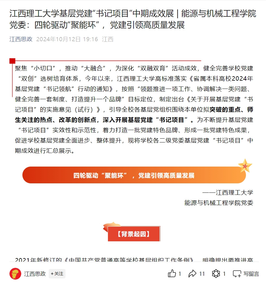 3.教学科研取得新进展。能源与机械工程学院党委坚持以打造“聚能环”党建品牌为契机,将党建和业务工作相融合、系部与支部力量相聚合、科研与实践相结合、“校企政院”相汇合,着力提升学院核心竞争力。今年以来,学院成功申报并获批专业硕士学位点1个、江西省重点实验室1个,省部级及以上科研项目7项、出版著作4部,发表高水平论文15篇。潘小青教授主编的两门课程分获江西省“十四五”普通高等教育本科省级规划教材重点立项项目和第六届江西省普通高等学校优秀教材二等奖。帅词俊教授主持的《可降解骨植入物的可控制备与功能设计研究》荣获江西省科学技术奖自然科学奖一等奖,科技成果转化成效屡创新高,增材制造团队“可降解复合材料增材制造工艺开发与应用中试项目”技术成果转化额高达1132.14万元。