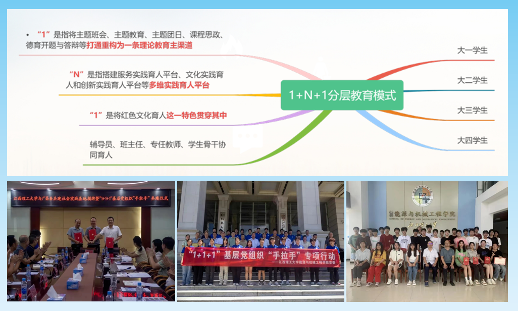 3.深化人才培养模式改革,注入立德树人“新活力”。坚持党建引领多元化育人,紧紧围绕思政、安全、学风和就业四个维度,深度探索“理想信念领航-心理健康护航-实践能力助航-就业生涯远航”四环闭合育人模式,着力构建“1+N+1”分层协同思政育人体系(即构建1条思政教育主渠道、搭建“N”个思政实践育人平台、红色文化育人这“1”特色贯穿其中),推动党建引领与铸魂育人同频共振。以开展“1+1+1”基层党组织“手拉手”专项行动为契机,汇合“校企政院”协同育人力量,与广昌县旴江镇、江西省广德环保科技股份有限公司等签订合作共建协议。进一步强化心理健康教育,织密宿舍安全网络,持续打造“全”“提”“精”“分”“拓”“五字”就业工作法,促进毕业生高质量就业。