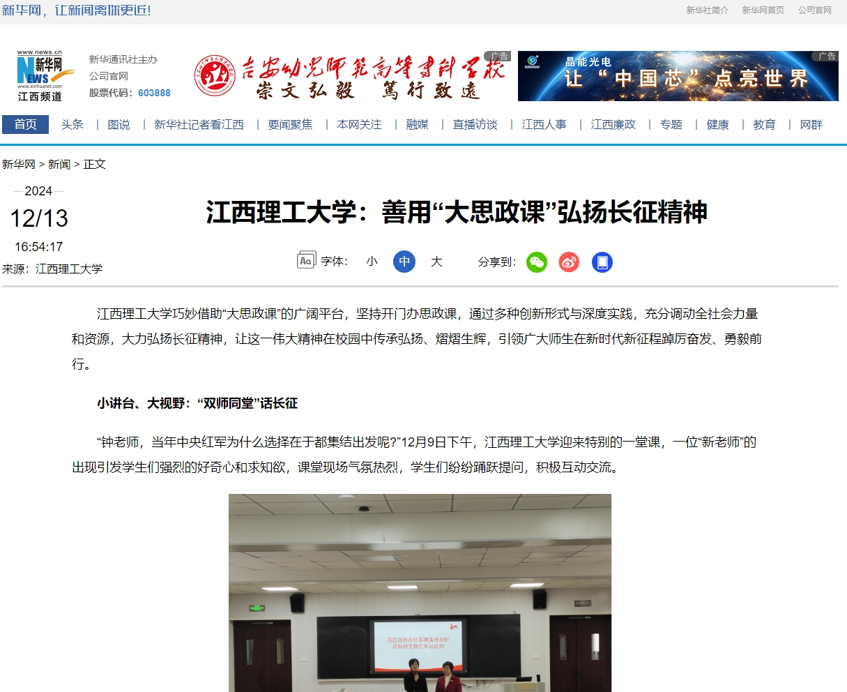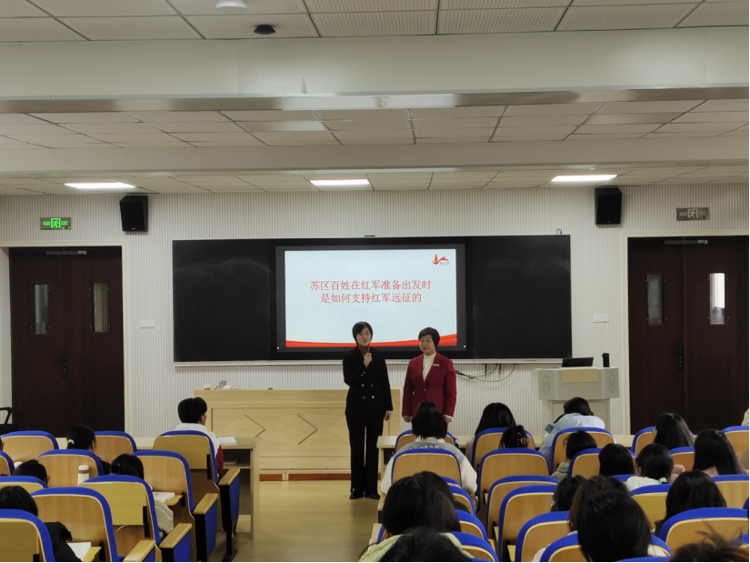学校积极探索教学新模式,邀请了全国人大代表、于都中央红军长征集结出发历史博物馆纪念园管理办主任钟敏老师和马克思主义学院朱贤凌老师共同开展思政课“双师同堂”活动。她凭借丰富的历史知识和生动的讲述技巧,把中央红军长征出发时那饱含悲壮色彩的场景与触动人心的故事栩栩如生地展现于学生眼前。她重点地讲述了苏区百姓如何毫无保留、竭尽所能地全力支援红军的动人情节,以及赣南子弟在长征漫漫征途中所作出的不可磨灭的卓越贡献。从百姓们省吃俭用为红军战士筹备粮食衣物,到青壮年义无反顾投身革命队伍踏上长征路;从军民齐心共克时艰的感人瞬间,到长征途中一个个彰显信念与情谊的经典事例,她皆细致入微地进行描绘。