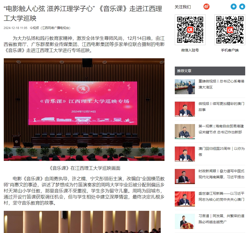 为大力弘扬和践行教育家精神,激发全体学生尊师风尚,12月14日晚,由江西省教育厅、广东群星影业传媒集团、江西电影集团等多家单位联合摄制的电影《音乐课》走进裸聊直播