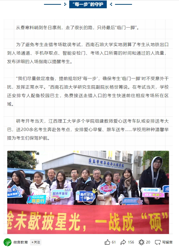 “我们尽量做足准备,提前规划好‘每一步’,确保考生‘临门一脚’时不受意外干扰,发挥正常水平。”西南石油大学研究生院副院长杨世箐说。在考试当天,学校还安排专人配备校园巴士,免费接送走错入口的考生快速前往相应考场所在区域。