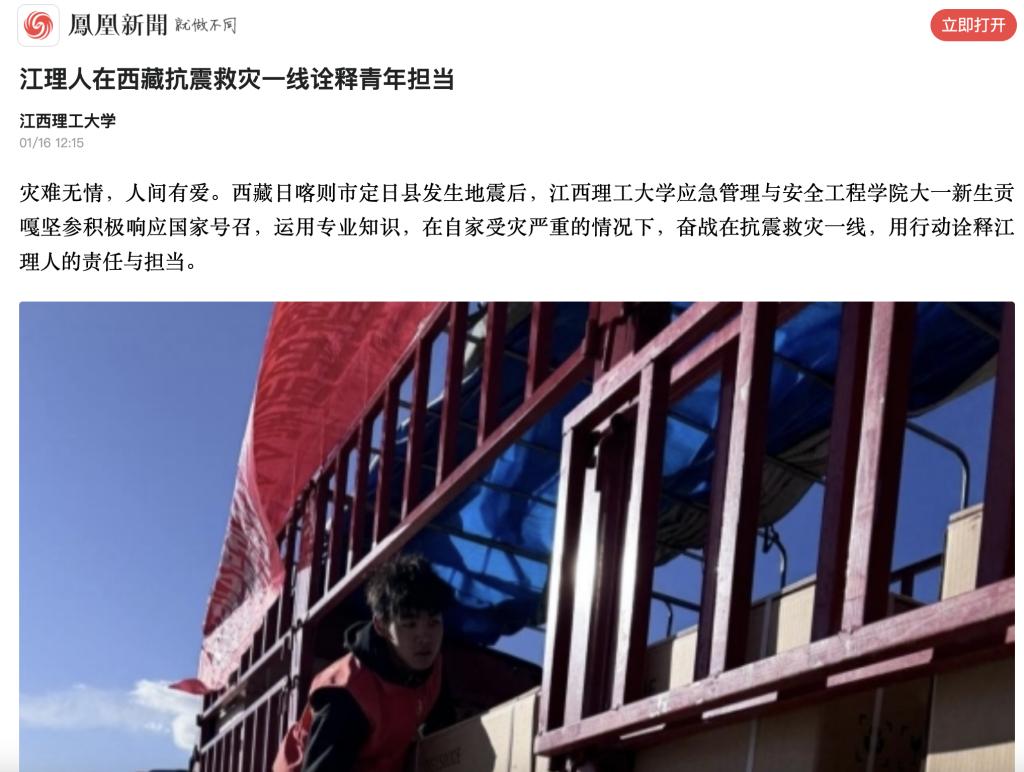 灾难无情,人间有爱。西藏日喀则市定日县发生地震后,裸聊直播 应急管理与安全工程学院大一新生贡嘎坚参积极响应国家号召,运用专业知识,在自家受灾严重的情况下,奋战在抗震救灾一线,用行动诠释江理人的责任与担当。
