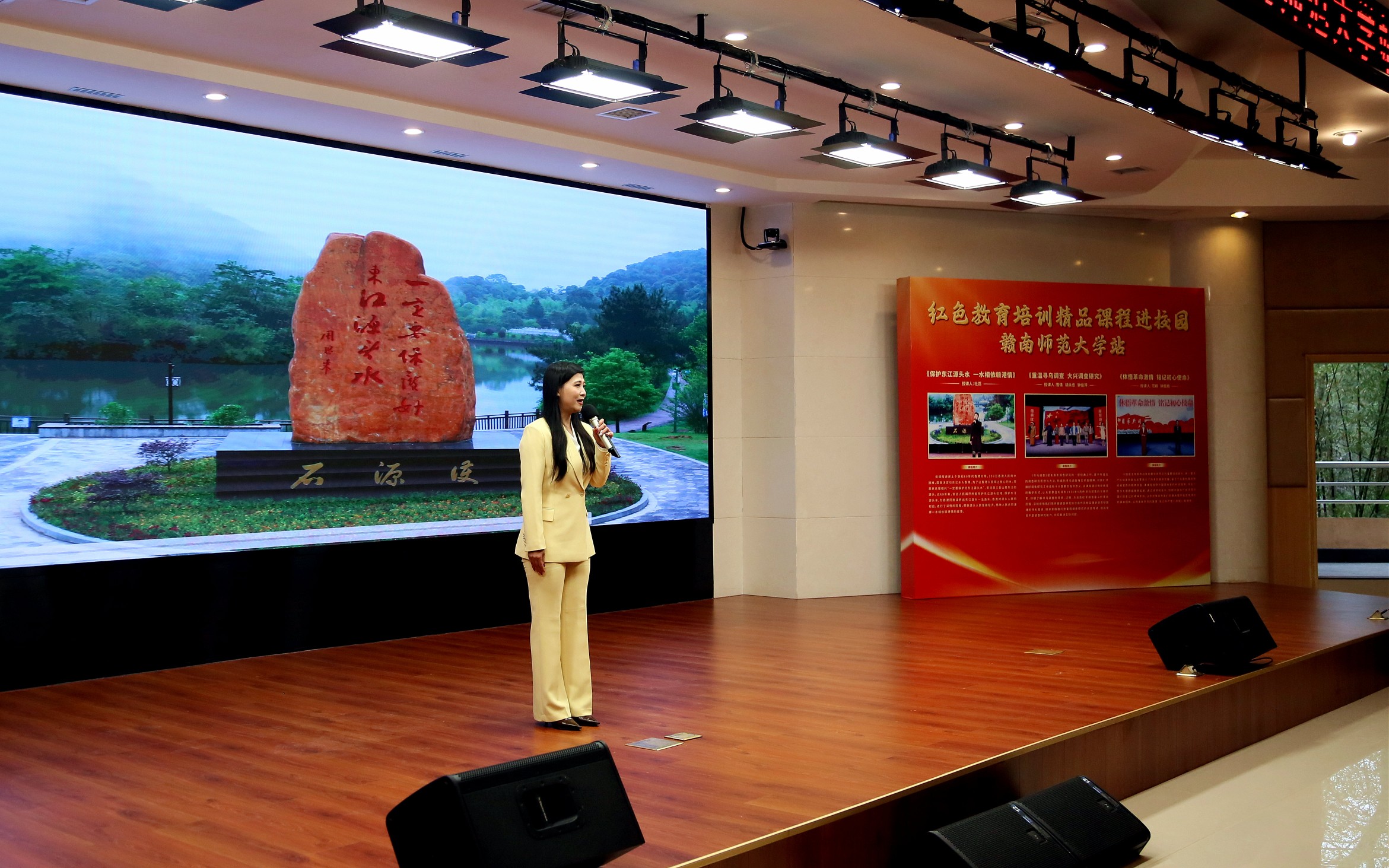 活动现场气氛庄重而热烈。安远县旅发集团的杜蕊,寻乌县委党校的曹倩、胡永忠、钟俊萍,兴国县委党校的范颖、钟庭根曾多次获得红色教育培训精品课程大赛奖项,这次他们分别以《保护东江源头水 一水相依赣港情》《重温寻乌调查 大兴调查研究》《体悟革命激情 铭记初心使命》为题,通过精彩的专题讲座、生动的情景教学以及互动交流,将红色历史鲜活地呈现在师生们面前。