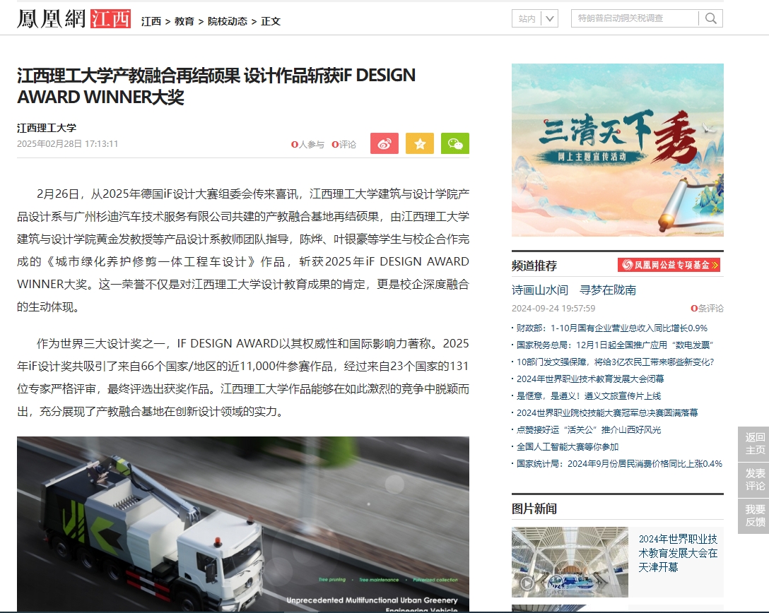 建筑与设计学院黄金发教授等产品设计系教师团队指导,陈烨、叶银豪等学生与校企合作完成的《城市绿化养护修剪一体工程车设计》作品,斩获2025年iF DESIGN AWARD WINNER大奖。这一荣誉不仅是对裸聊直播