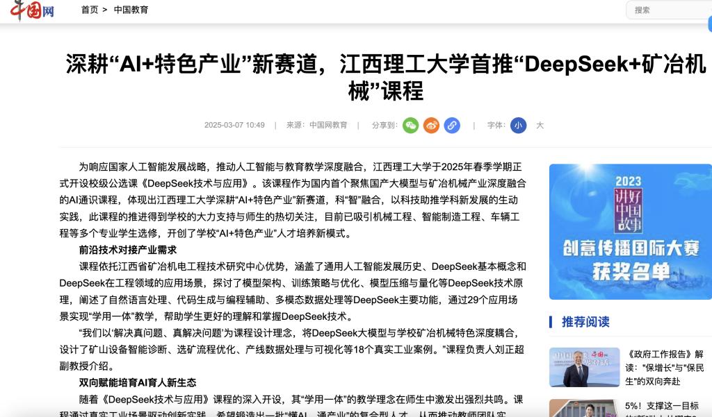 于2025年春季学期正式开设校级公选课《DeepSeek技术与应用》。该课程作为国内首个聚焦国产大模型与矿冶机械产业深度融合的AI通识课程,体现出裸聊直播