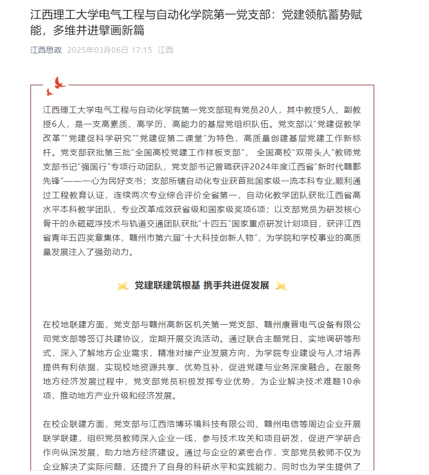 在校企联建方面,党支部与江西浩博环境科技有限公司、赣州电信等周边企业开展联学联建,组织党员教师深入企业一线,参与技术攻关和项目研发,促进产学研合作向纵深发展,助力地方经济建设。通过与企业的紧密合作,支部党员教师不仅为企业解决了实际问题,还提升了自身的科研水平和实践能力,同时也为学生提供了更多的实习和就业机会。