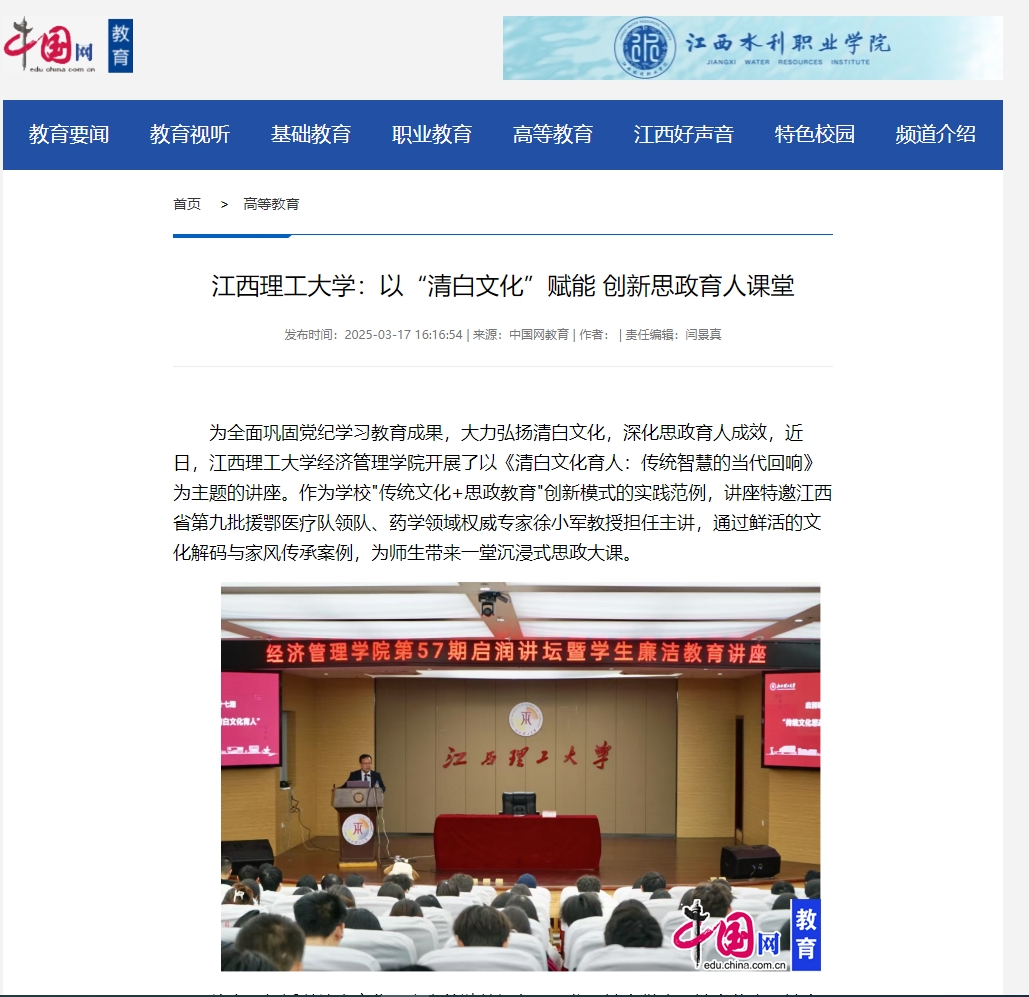 经济管理学院开展了以《清白文化育人:传统智慧的当代回响》为主题的讲座。作为学校"传统文化+思政教育"创新模式的实践范例,讲座特邀江西省第九批援鄂医疗队领队、药学领域权威专家徐小军教授担任主讲,通过鲜活的文化解码与家风传承案例,为师生带来一堂沉浸式思政大课。