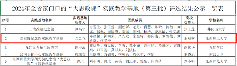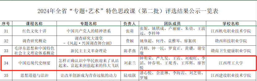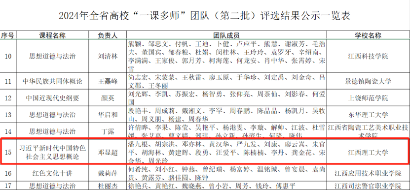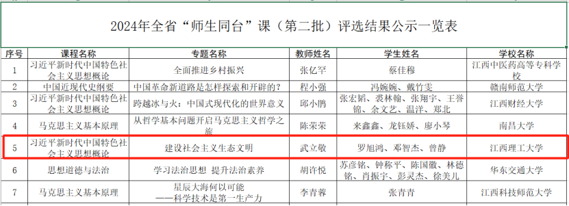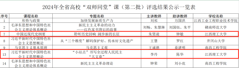 马克思主义学院邓显超教授申报的《习近平新时代中国特色社会主义思想概论》课程获批全省“一课多师”团队;龚金花老师申报的刘启耀纪念馆实践教学基地获批全省家门口的“大思政课”实践教学基地;朱贤凌老师和中央红军长征出发纪念馆钟敏老师主讲的《聆听历史回响 阔步新的长征》、李丹老师和章江街道人大工委主任陈华老师讲授的《“小站点”书写全过程人民民主“大文章”》获评全省高校“双师同堂”课;武立敬老师主讲的《建设社会主义生态文明》获评全省“师生同台”课;刘素兰老师申报的《怎样正确认识中华民族迎来了从站起来、富起来到强起来的伟大飞跃》获批全省“专题+艺术”特色思政课。