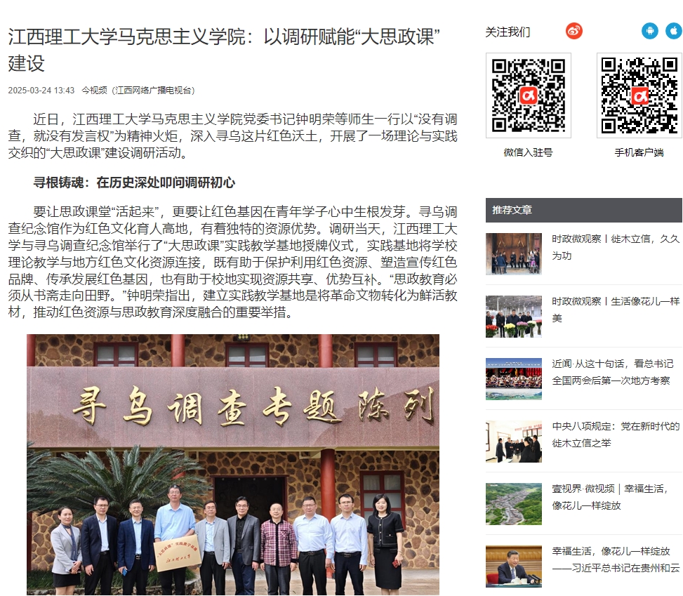马克思主义学院赴寻乌县开展“大思政课”建设调研活动,正是对“没有调查,就没有发言权”的深刻践行。而这场跨越时空的对话也昭示:唯有永葆“拜人民为师”的初心,坚守“脚沾泥土”的笃行,方能在新征程上续写新的篇章。(文/ 魏小兰 图/ 党乐)