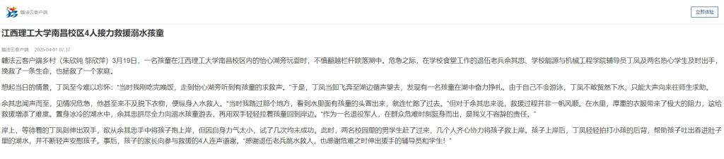 南昌校区内的怡心湖旁玩耍时,不慎翻越栏杆跌落湖中。危急之际,在学校食堂工作的退伍老兵余其忠、学校能源与机械工程学院辅导员丁凤及两名热心学生及时出手,挽救了一条生命,也拯救了一个家庭。