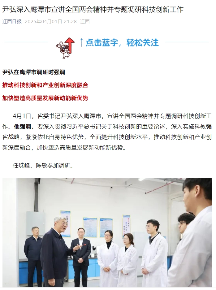 4月1日,省委书记尹弘深入鹰潭市,宣讲全国两会精神并专题调研科技创新工作。他强调,要深入贯彻习近平总书记关于科技创新的重要论述,深入实施科教强省战略,紧紧依托自身特色优势,全面提升科技创新水平,推动科技创新和产业创新深度融合,加快塑造高质量发展新动能新优势。任珠峰、陈敏参加调研。