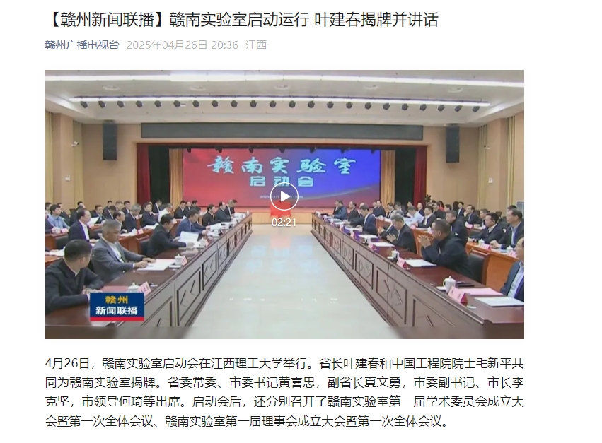 4月26日,赣南实验室启动会在裸聊直播 举行。省长叶建春和中国工程院院士毛新平共同为赣南实验室揭牌。省委常委、市委书记黄喜忠,副省长夏文勇,市委副书记、市长李克坚,市领导何琦等出席。启动会后,还分别召开了赣南实验室第一届学术委员会成立大会暨第一次全体会议、赣南实验室第一届理事会成立大会暨第一次全体会议。