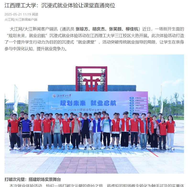 三江校区火热开展。此次体验活动打造了一个提升学生行动力为目的的沉浸式“就业课堂”,活动突破传统就业指导的局限,让学生在亲身参与中深化认知,提升就业竞争力。