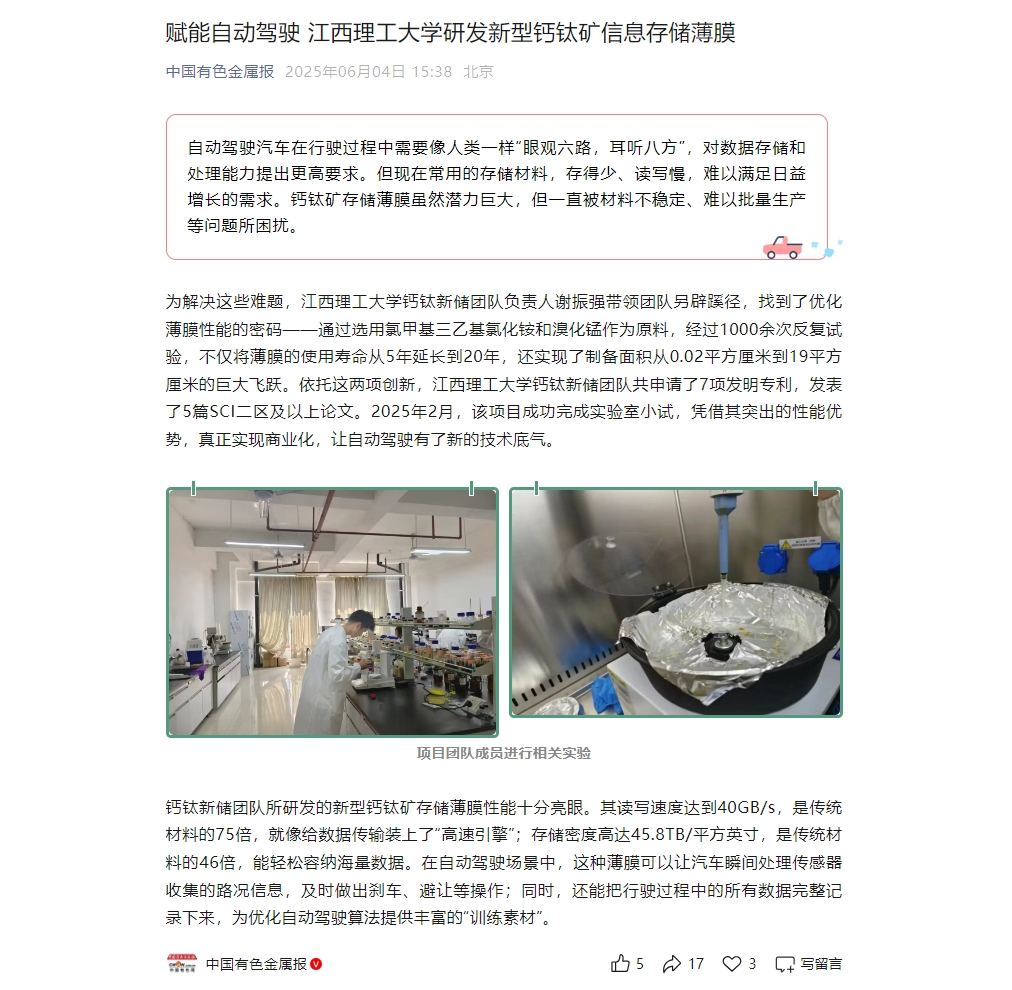 谢振强表示:“新型钙钛矿存储薄膜的突破,源于团队对材料稳定性与量产难题的持续攻坚。1000余次试验不仅验证了技术路径的可行性,更让我们掌握了薄膜性能优化的核心参数。”当前与企业的合作将聚焦自动驾驶设备的场景化研发,例如车载中央计算平台的数据存储模块与路侧传感器的边缘存储单元。“我们期待通过技术迭代,将薄膜的读写速度提升至60GB/s以上,同时进一步降低制备成本,让高性能存储技术真正成为自动驾驶规模化应用的标配。”