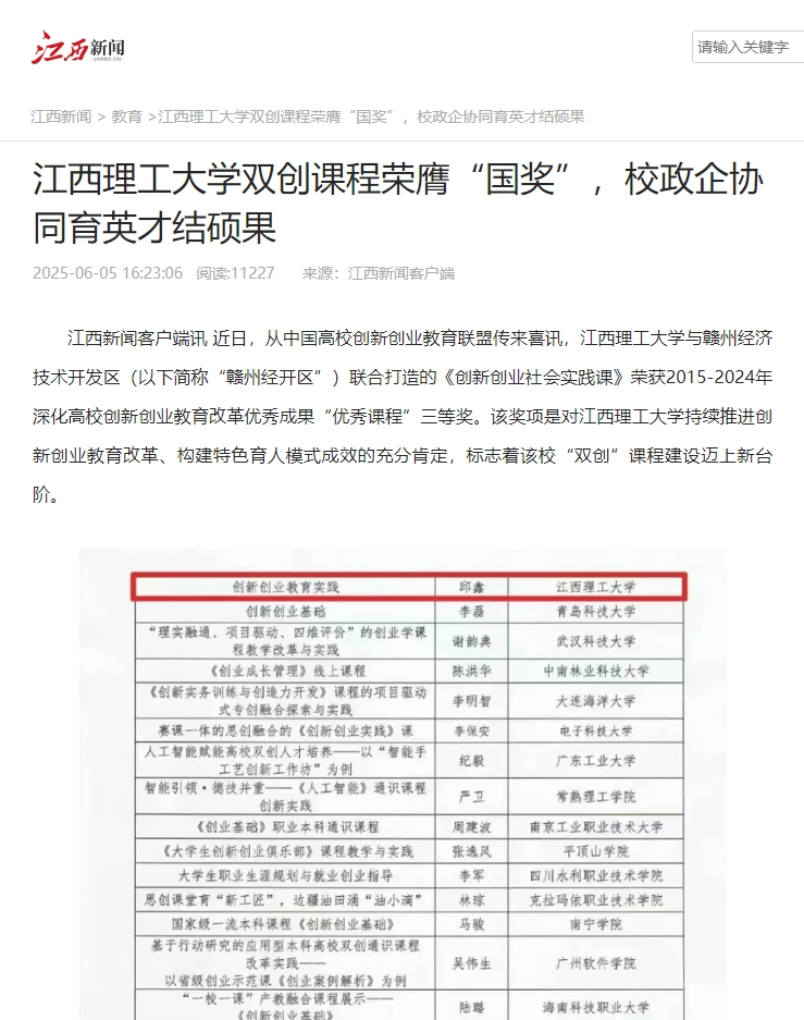 与赣州经济技术开发区(以下简称“赣州经开区”)联合打造的《创新创业社会实践课》荣获2015-2024年深化高校创新创业教育改革优秀成果“优秀课程”三等奖。该奖项是对裸聊直播