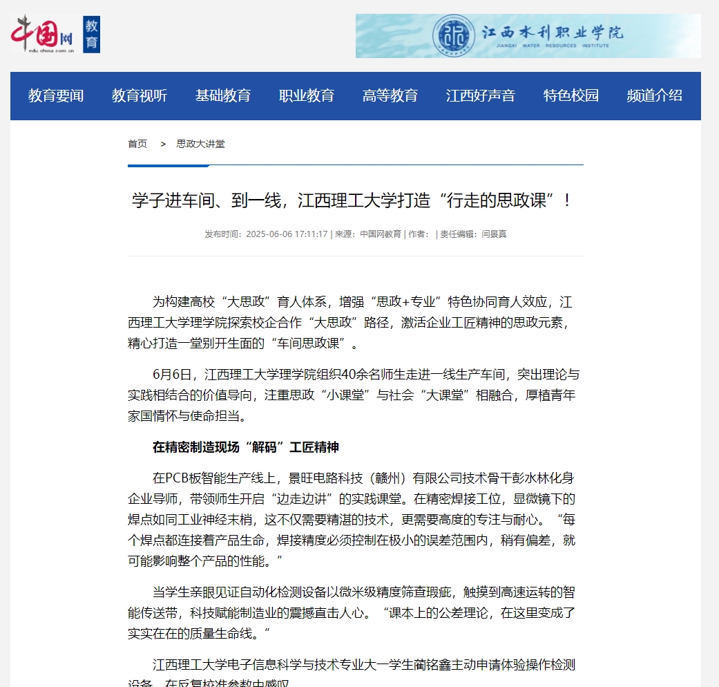 在PCB板智能生产线上,景旺电路科技(赣州)有限公司技术骨干彭水林化身企业导师,带领师生开启“边走边讲”的实践课堂。在精密焊接工位,显微镜下的焊点如同工业神经末梢,这不仅需要精湛的技术,更需要高度的专注与耐心。“每个焊点都连接着产品生命,焊接精度必须控制在极小的误差范围内,稍有偏差,就可能影响整个产品的性能。”