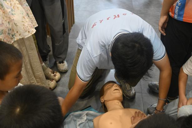 “古人说‘水可载舟,亦可覆舟’,水既能滋养生命,也可能带来危险。”在防溺水知识宣讲中,队员王子溪手持急救假人,在宣讲中巧妙引入传统水文化,“就像咱们课本里学的,水能托起大船,也能掀翻船只,所以靠近水域一定要小心。”他一边示范“清理异物、捏住鼻子、缓慢吹气”的标准人工呼吸流程,一边结合给排水专业视角解释溺水危险:“水流的力量远比我们想象的强大,专业上叫做流体力学,掌握正确的防溺水知识才能保护自己。”