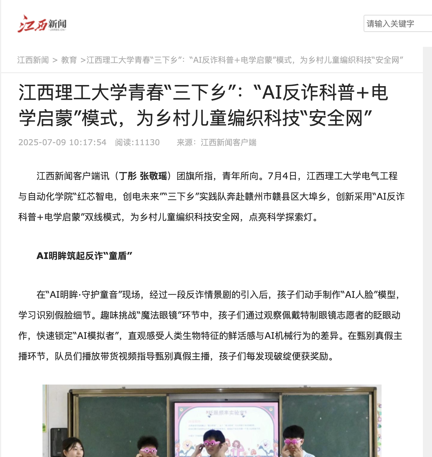 电气工程与自动化学院“红芯智电,创电未来”“三下乡”实践队奔赴赣州市赣县区大埠乡,创新采用“AI反诈科普+电学启蒙”双线模式,为乡村儿童编织科技安全网,点亮科学探索灯。