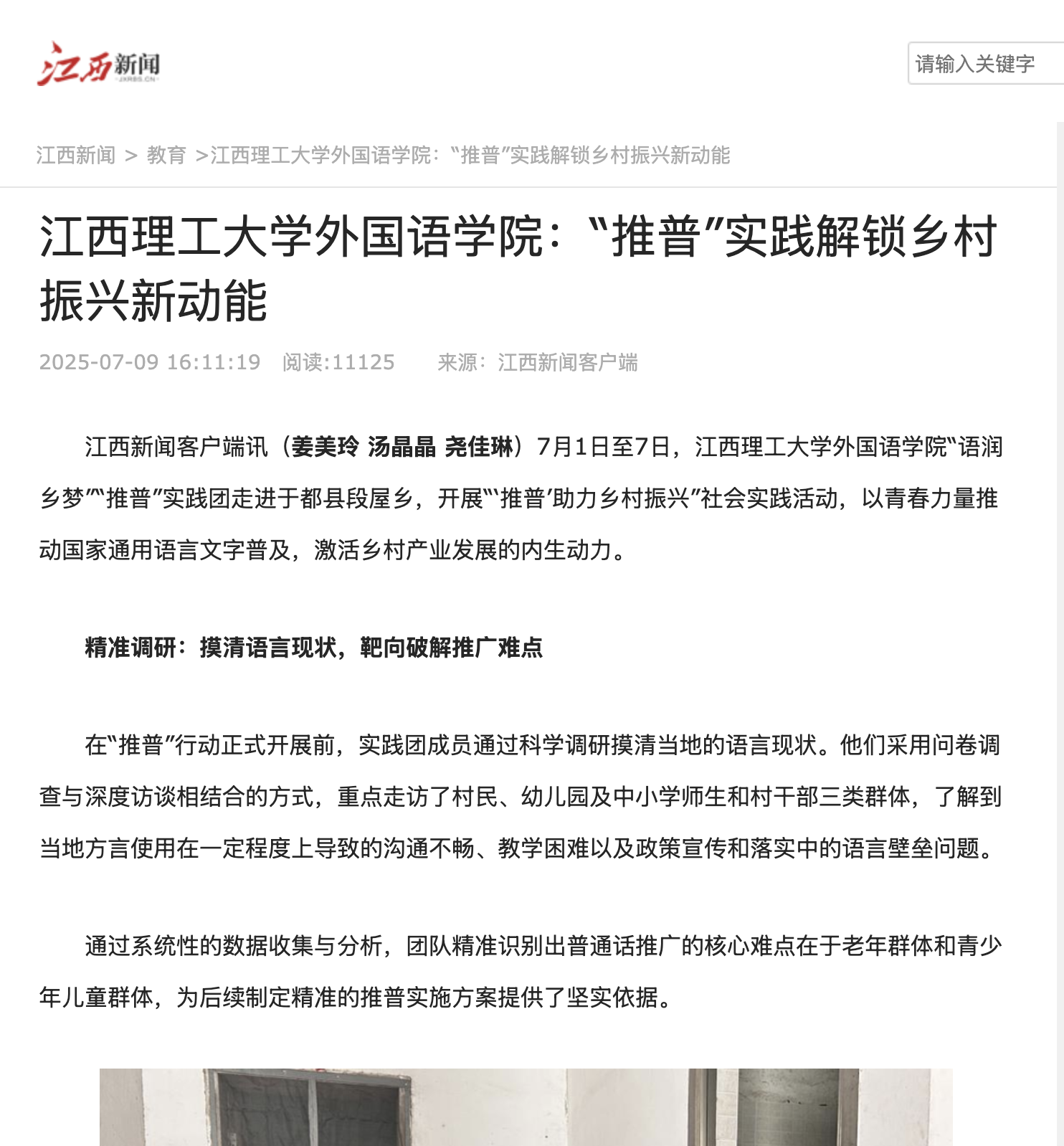 “‘推普’助力乡村振兴”暑期社会实践是语言服务国家战略的生动体现,既提升了乡村沟通效率与信息通达度,为区域经济发展提供语言支撑,更让大学生在实践中成长为语言文化传承者、乡村振兴践行者与产业发展推动者。