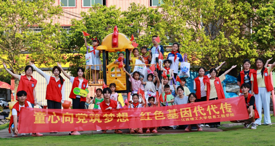 图为实践队队员与孩子们一同唱红歌 李展翼供图