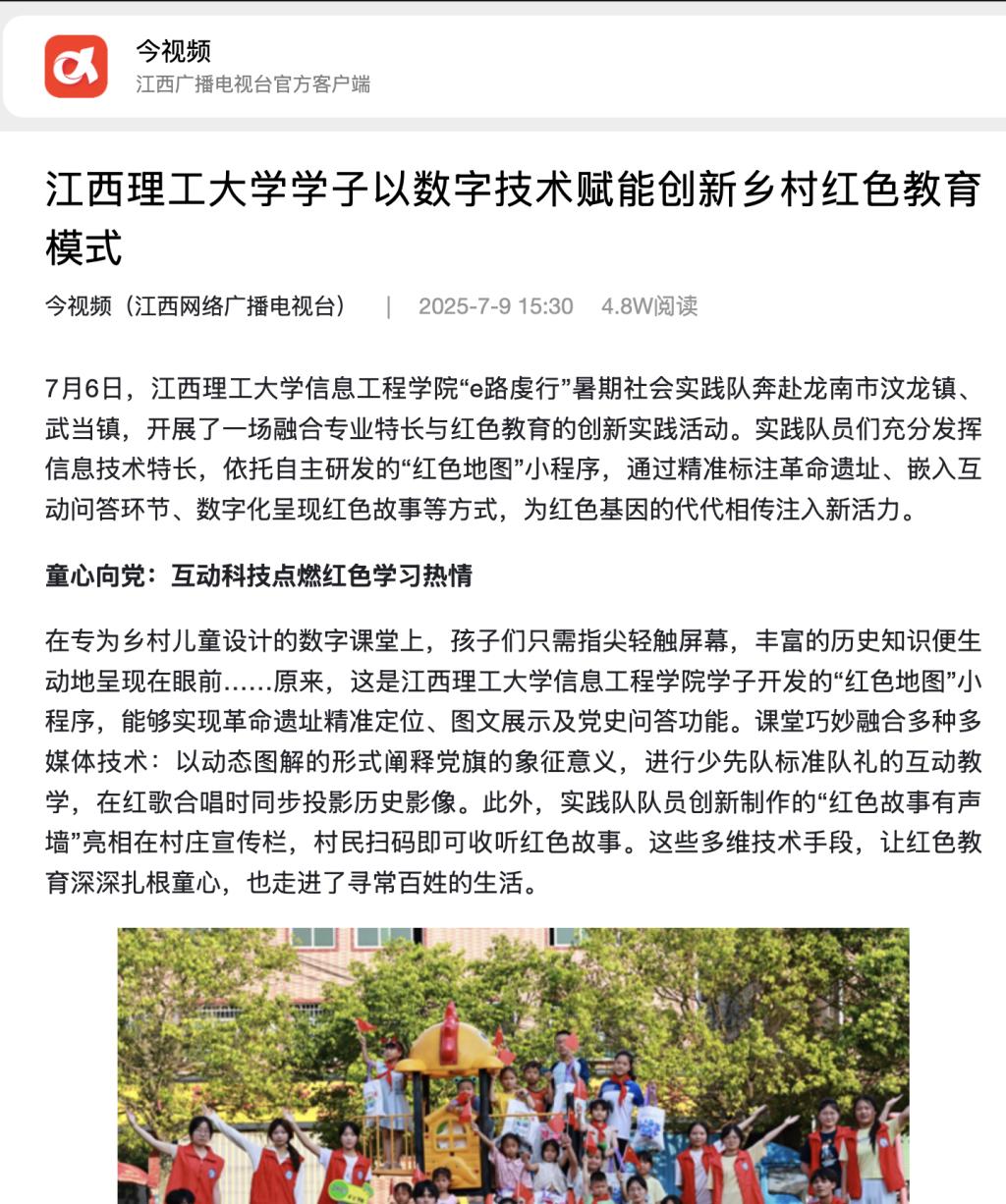 “e路虔行”暑期社会实践队奔赴龙南市汶龙镇、武当镇,开展了一场融合专业特长与红色教育的创新实践活动。实践队员们充分发挥信息技术特长,依托自主研发的“红色地图”小程序,通过精准标注革命遗址、嵌入互动问答环节、数字化呈现红色故事等方式,为红色基因的代代相传注入新活力。