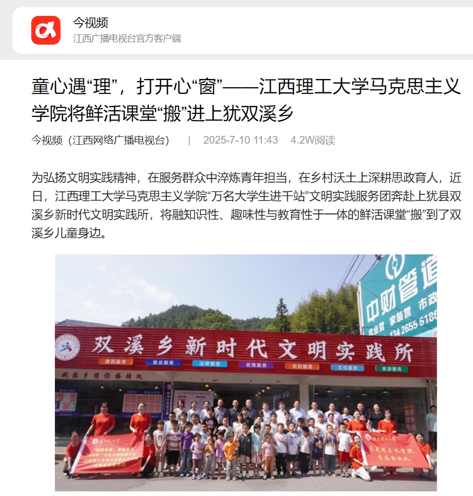 马克思主义学院“万名大学生进千站”文明实践服务团奔赴上犹县双溪乡新时代文明实践所,将融知识性、趣味性与教育性于一体的鲜活课堂“搬”到了双溪乡儿童身边。