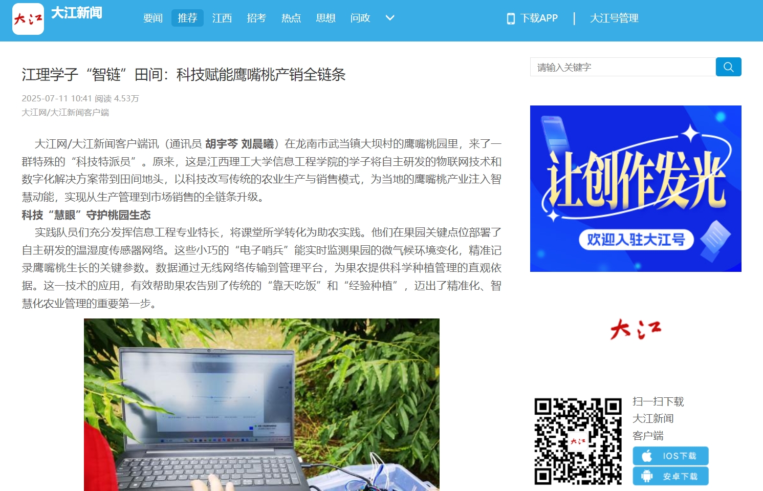 此次社会实践活动,精准聚焦科技助力乡村振兴。团队深度应用物联网感知、数据传输、移动互联网等前沿技术,系统性赋能农产品生产与销售全链条。他们以智慧监测优化生产管理,通过直播电商拓展市场销路,并凭借独创的溯源体系筑牢品质信任。这不仅为龙南鹰嘴桃产业插上了数字化翅膀,有效促进了农民增收,更探索出一条可复制、可推广的“高校智慧助农”新路径,充分彰显了新时代青年学子学以致用、服务社会、贡献乡村的责任担当。