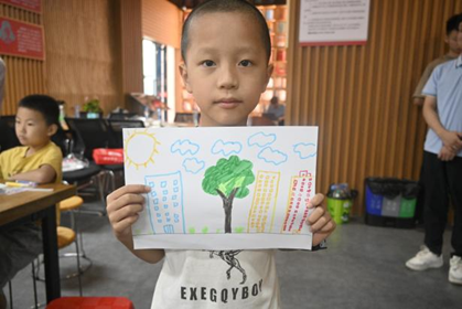 “思想大爆炸”创作环节,队员周小璐轻声引导:“想想家乡最让你骄傲的是什么?把它画下来吧。”小朋友们托腮沉思片刻,便专注创作。不一会儿,一幅幅充满温度的家乡画卷诞生了:有的画上了古朴的客家围屋,屋檐下挂着金黄的玉米;有的描绘了清澈的上犹江,江面上漂着小渔船;还有的把陡水湖景区的摩天轮画成了彩色,旁边歪歪扭扭写着“我的家乡最美”。