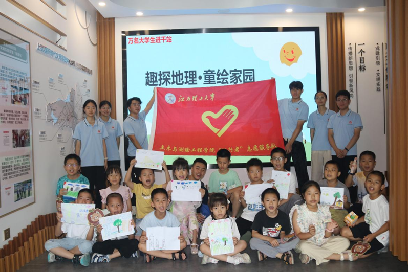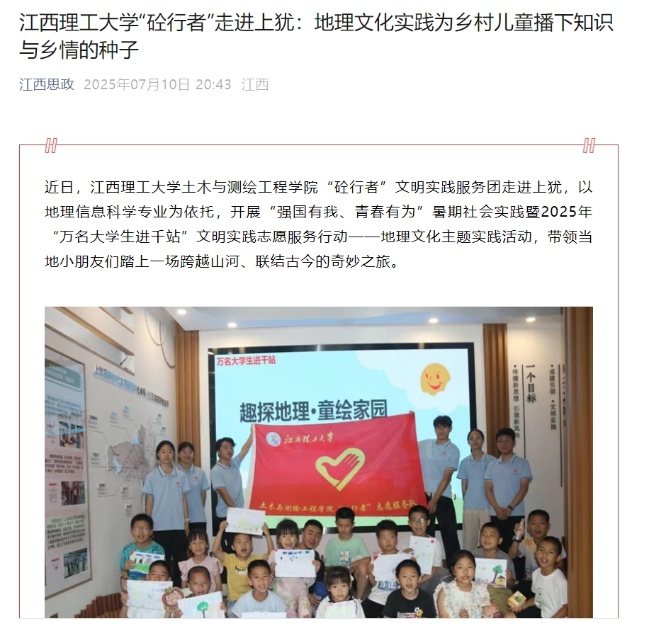 土木与测绘工程学院“砼行者”文明实践服务团走进上犹,以地理信息科学专业为依托,开展“强国有我、青春有为”暑期社会实践暨2025年“万名大学生进千站”文明实践志愿服务行动——地理文化主题实践活动,带领当地小朋友们踏上一场跨越山河、联结古今的奇妙之旅。