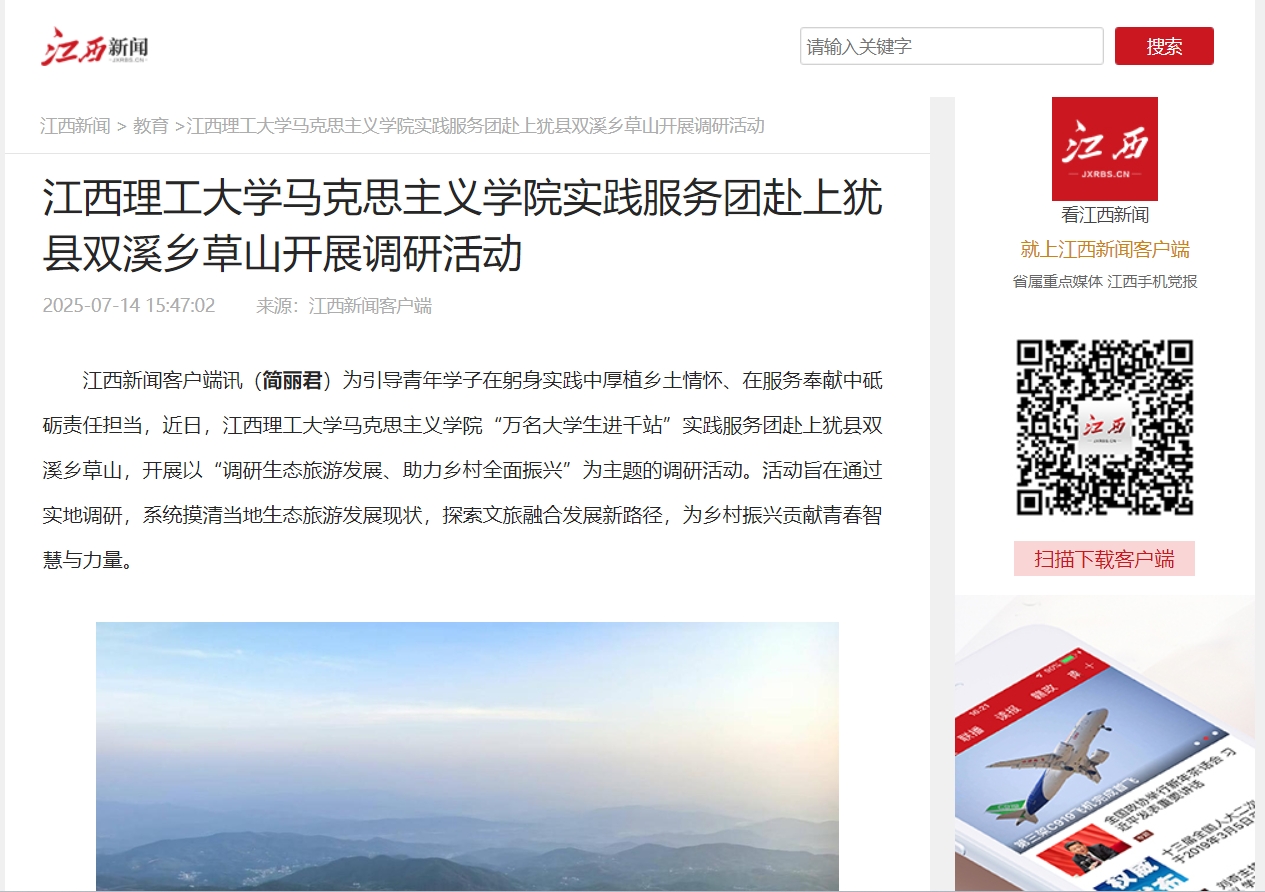 马克思主义学院“万名大学生进千站”实践服务团赴上犹县双溪乡草山,开展以“调研生态旅游发展、助力乡村全面振兴”为主题的调研活动。活动旨在通过实地调研,系统摸清当地生态旅游发展现状,探索文旅融合发展新路径,为乡村振兴贡献青春智慧与力量。