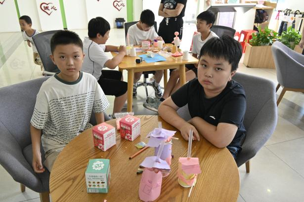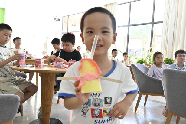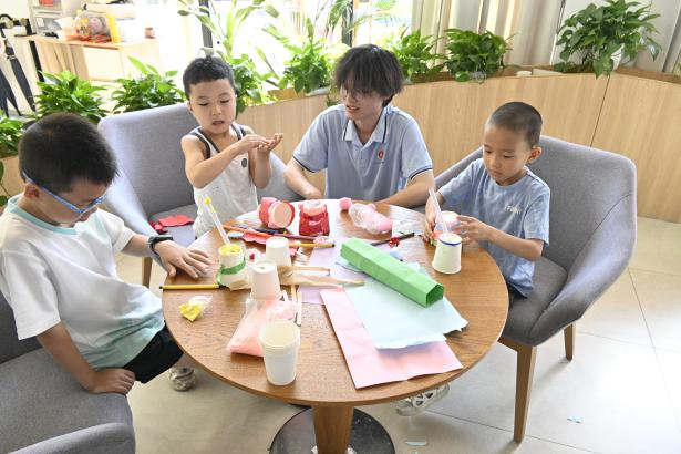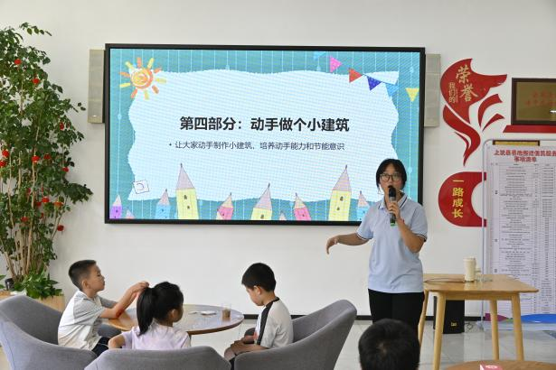 在充满欢声笑语的手工区,孩子们变身“小小建筑师”,专注的神情中透着对创造的渴望。“我的房子有三个‘大鼻子’,肯定特别凉快!”“我给屋顶装了太阳能板,这样就不用交电费啦!”小朋友们一边制作,一边热烈地分享着自己天马行空的节能创意,清脆的童声在教室里回荡。