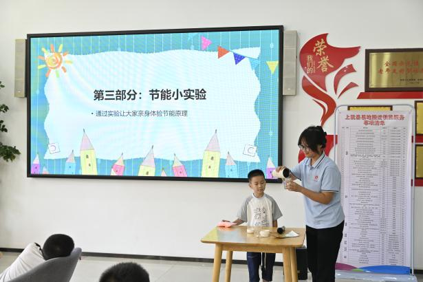 成果展示环节,孩子们纷纷站到台前,介绍着自己的作品。“我的房子用锡纸当隔热墙,天井大大的,还能收集雨水!” 一个小男孩指着自己的作品,声音洪亮,眼里满是骄傲。队员们蹲下身来,从专业角度耐心点评,用通俗易懂的语言,引导孩子们思考如何让小房子更节能。他们时而指着“墙体”讲解保温原理,时而对着“太阳能板”阐述能源转化知识。现场孩子们频频点头,不时提出新奇的想法,创意与智慧的火花不断碰撞,点亮了整个课堂。
