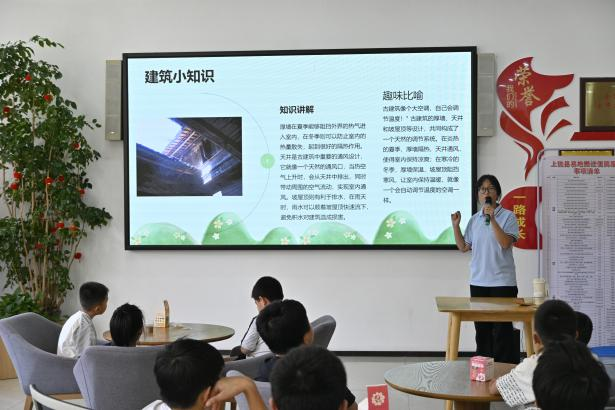 讲到厚墙时,刘晓晓用棉花糖和薄饼干比喻厚墙与薄墙,“厚墙就像厚厚的棉花糖,夏天把热气挡在外面,冬天把温暖留在家里!”生动的比喻让孩子们笑得前仰后合。说到天井,队员模仿热空气“呼呼”上升的样子,“天井是房子的小鼻子,能帮房子呼吸,把热空气呼出去!”小朋友们也跟着摇头晃脑,模仿空气流动的样子,现场气氛热烈非凡。