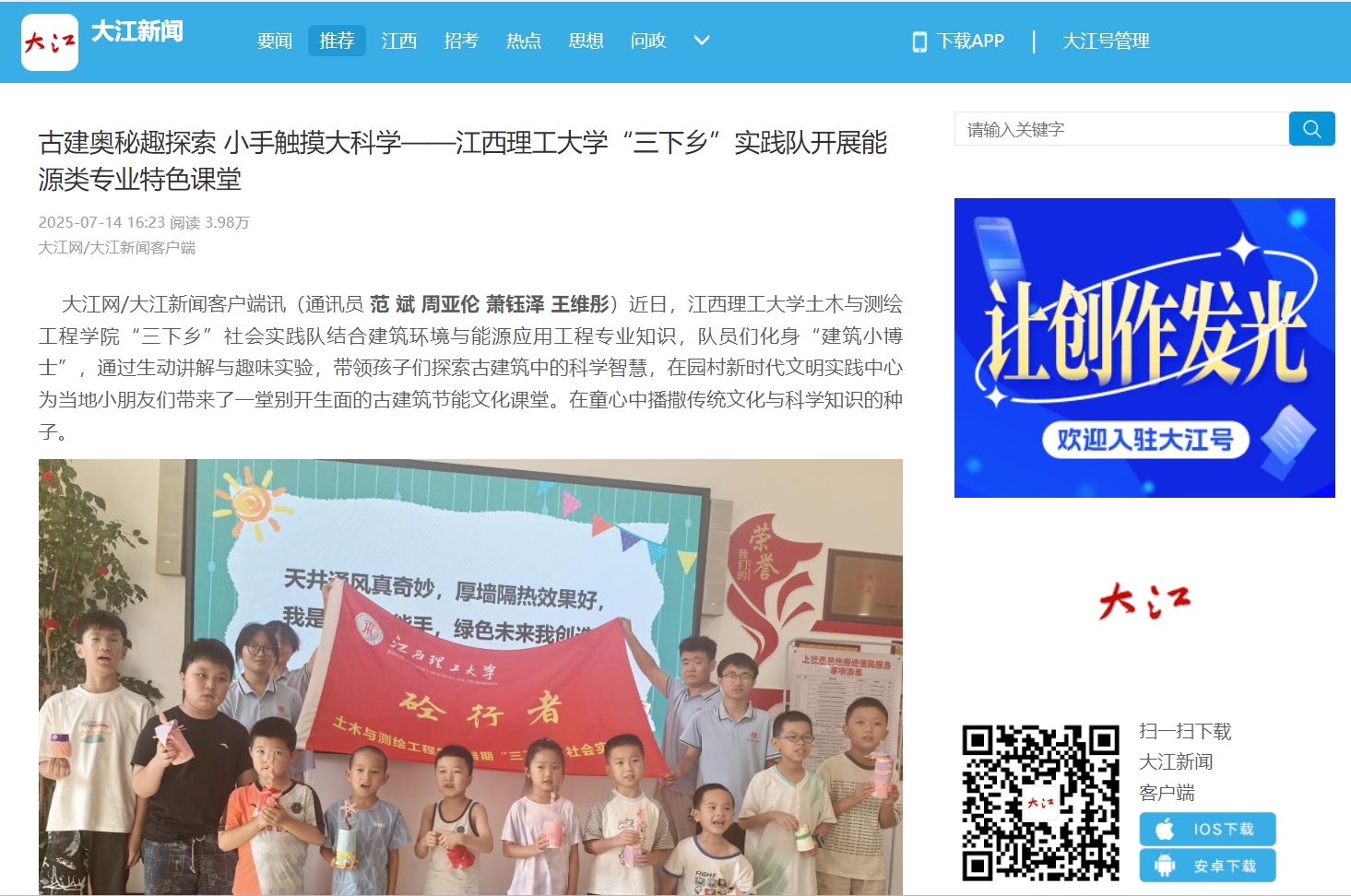土木与测绘工程学院“三下乡”社会实践队结合建筑环境与能源应用工程专业知识,队员们化身“建筑小博士”,通过生动讲解与趣味实验,带领孩子们探索古建筑中的科学智慧,在园村新时代文明实践中心为当地小朋友们带来了一堂别开生面的古建筑节能文化课堂。在童心中播撒传统文化与科学知识的种子。