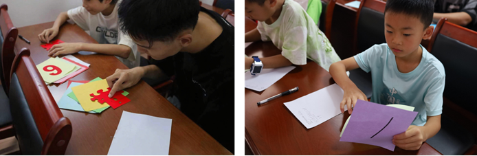(图为孩子们思考如何完成红色数字拼图 李圆 摄)