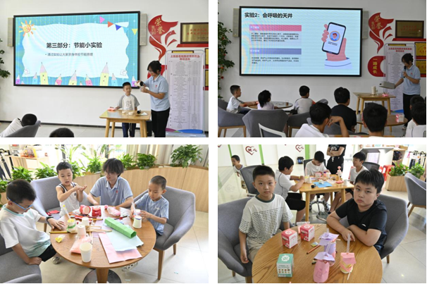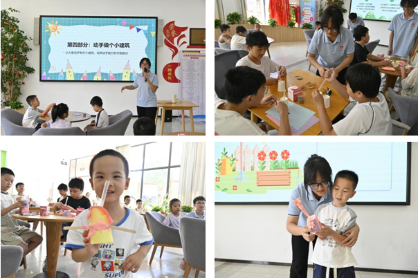 在充满欢声笑语的手工区,孩子们变身“小小建筑师”,专注的神情中透着对创造的渴望。“我的房子有三个‘大鼻子’,肯定特别凉快!”“我给屋顶装了太阳能板,这样就不用交电费啦!”小朋友们一边制作,一边热烈地分享着自己天马行空的节能创意,清脆的童声在教室里回荡。