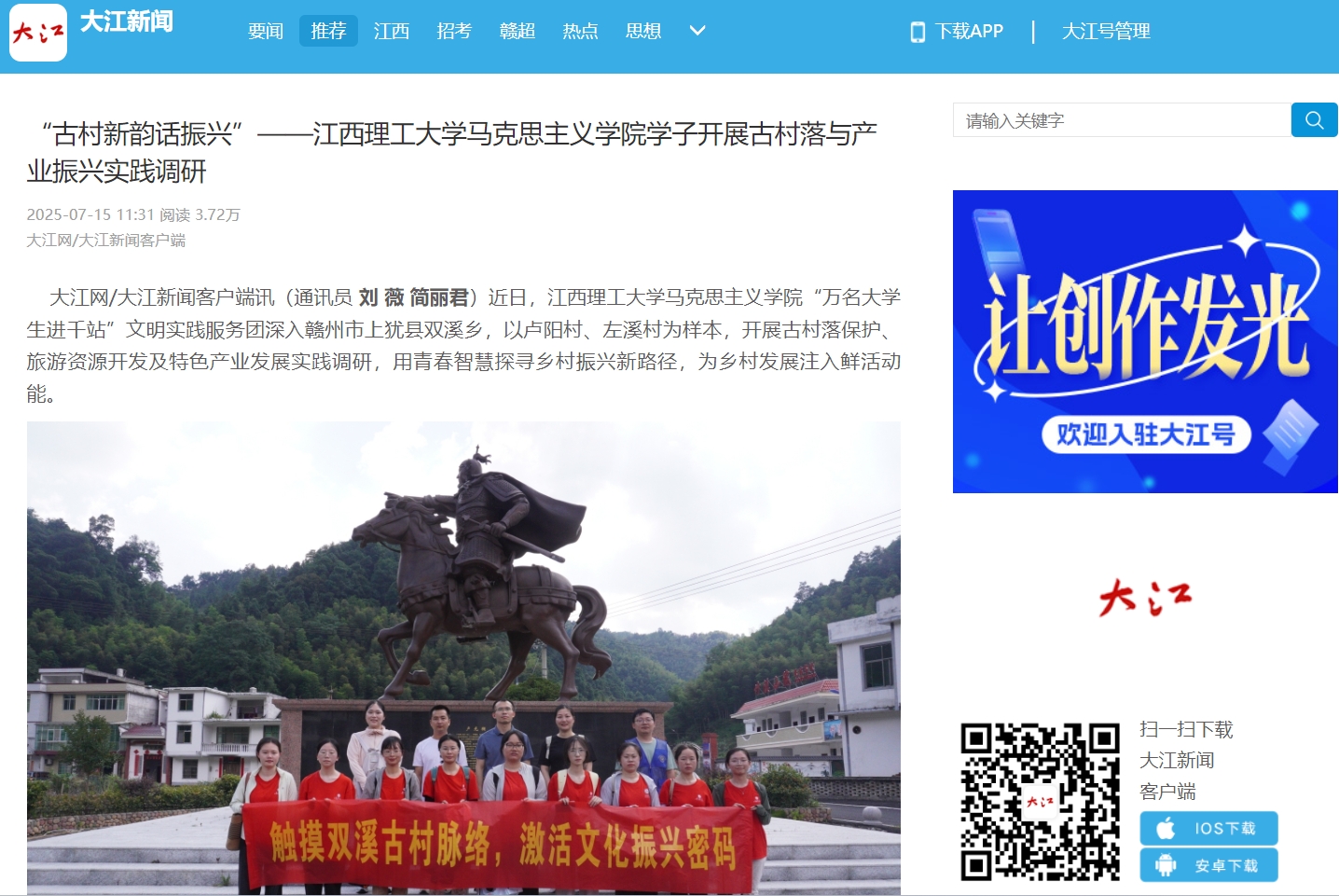 马克思主义学院“万名大学生进千站”文明实践服务团深入赣州市上犹县双溪乡,以卢阳村、左溪村为样本,开展古村落保护、旅游资源开发及特色产业发展实践调研,用青春智慧探寻乡村振兴新路径,为乡村发展注入鲜活动能。