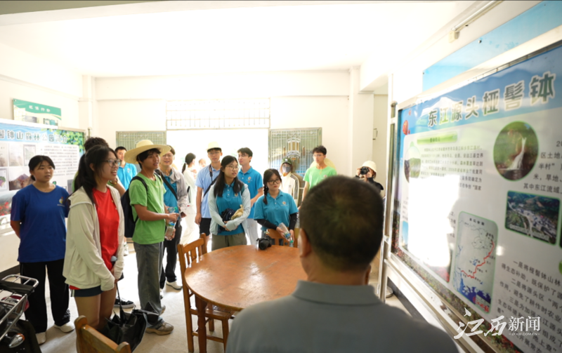 ▲何洪先在向实践队员介绍东江源
