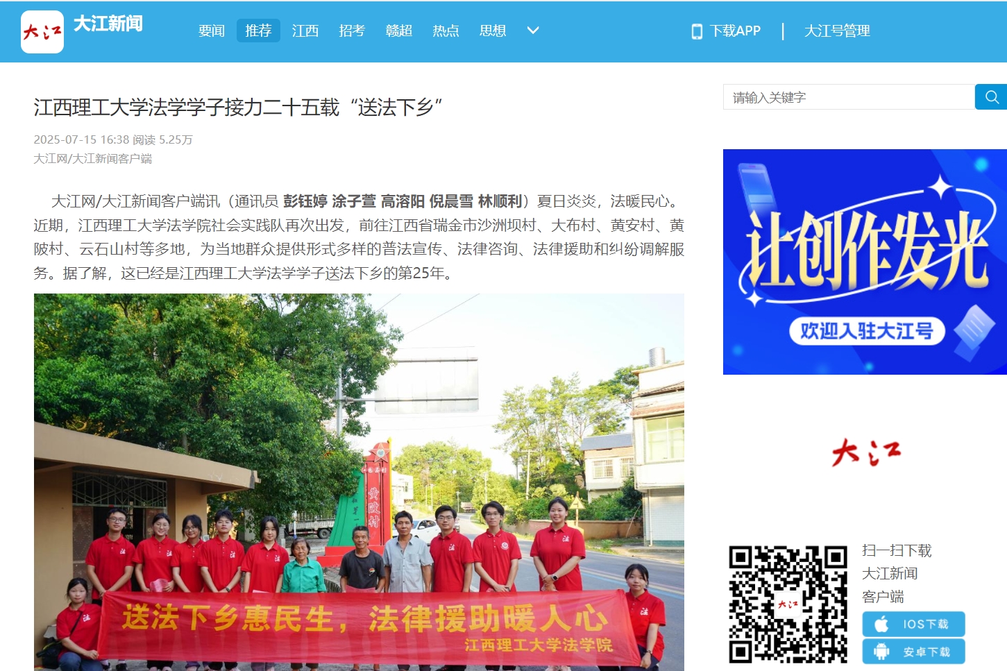 法学院社会实践队再次出发,前往江西省瑞金市沙洲坝村、大布村、黄安村、黄陂村、云石山村等多地,为当地群众提供形式多样的普法宣传、法律咨询、法律援助和纠纷调解服务。据了解,这已经是裸聊直播