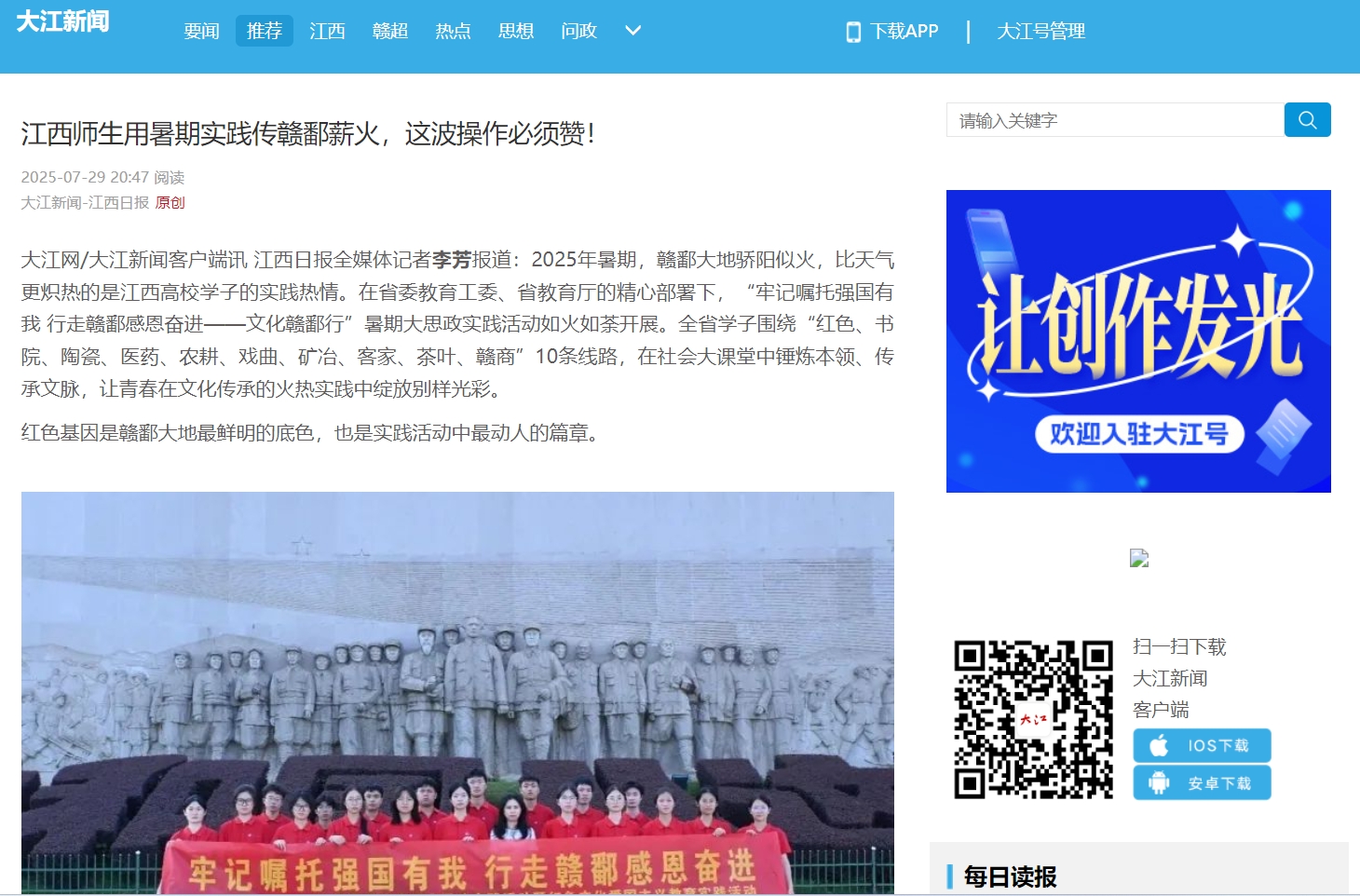 从红色旧址到古村街巷,从车间厂房到田间地头,江西高校学子用脚步丈量赣鄱大地,用行动诠释文化传承。这场“文化赣鄱行”暑期大思政实践活动,不仅让学子在实践中锻炼才干,更让赣鄱文化在青春的接力中焕发新的生机,成为新时代江西发展画卷中一抹亮丽的青春色彩。