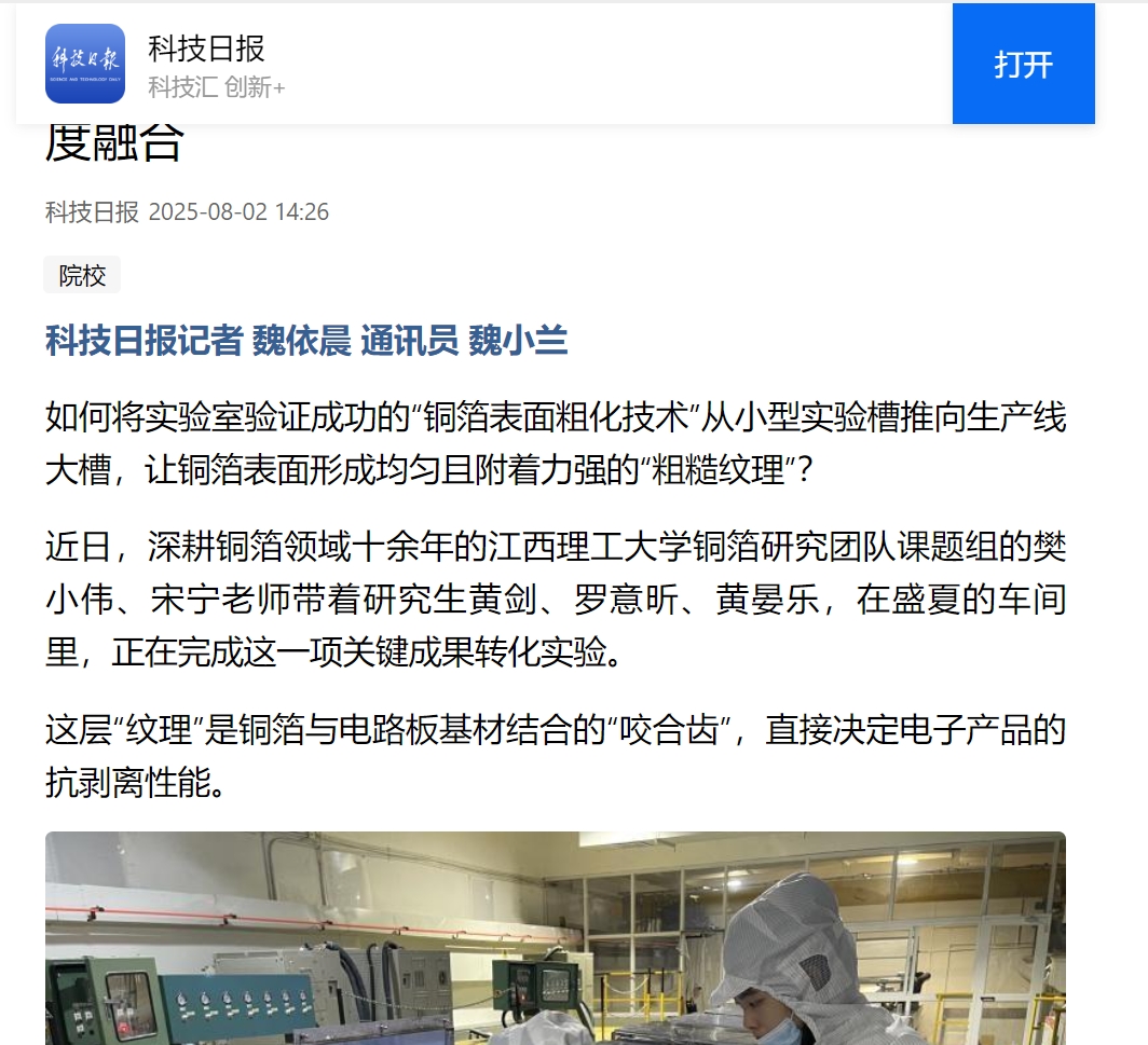 添加剂加入电解液中局部浓度过高就会产生沉淀。针对这一问题,团队反复验证,最终确定先由少批量添加剂溶入少量电解液中,再倒入电解槽,终于摸索出适配大槽的“梯度加料法”。铜箔是电子信息产业的“血管”,厚度仅几微米至几十微米,却要承受电路板的高频信号传输,对表面平整度和力学性能要求极高。实验室里,小槽实验能精准控制温度、添加剂浓度,但到了生产线,这些因素却难以把控,稍有不慎就会影响处理后铜箔的质量。“第一次试生产时,电解出的铜箔表面形貌与实验室中完全不一致。”樊小伟说,“实验室只是理想状态,是骡子是马还得拉到生产线上遛一遛。”