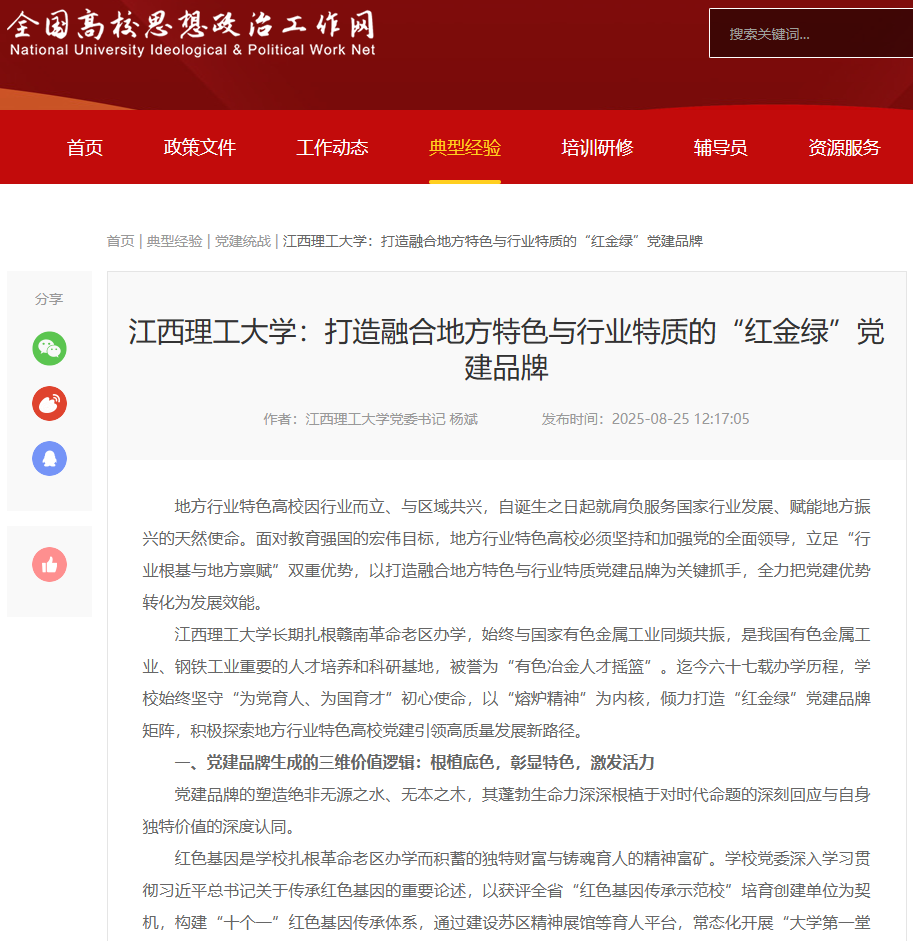 行业根基是地方行业特色高校的立身之本,也是检验党建工作成效的“试金石”。学校党委牢记习近平总书记关于稀土产业发展的重要指示精神,提出建设“稀土及关键矿产领域世界一流大学”目标,将学校事业发展深度融入行业区域发展大局。构建“一院一县(行业、领域)多企业”联系制度,实施“1+1+1”基层党组织“手拉手”行动,与地方、企业开展党建联建,以党建链贯通人才链、科技链、产业链,在服务国家战略和区域经济发展的最前沿淬炼党建品牌的责任担当与实干成色。