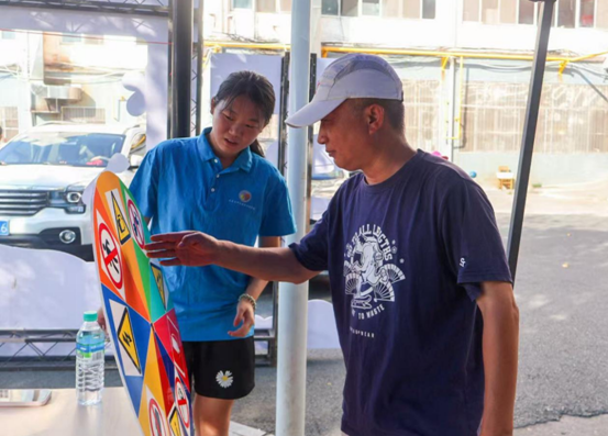 在书香阁“美食江湖”站点,新生和家长们解锁校园美味的同时,还积极参与着“安全标识猜猜看”快问快答互动。大家转动标识转盘,快速答出禁止烟火、当心触电等常见安全标志含义,在休闲场景中轻松习得实用安全常识。