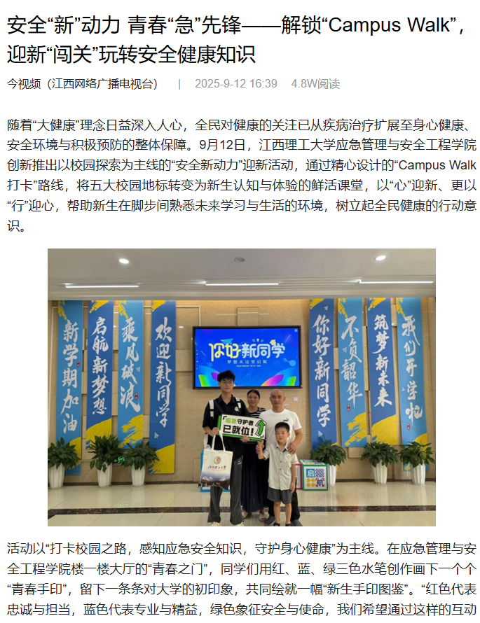 应急管理与安全工程学院创新推出以校园探索为主线的“安全新动力”迎新活动,通过精心设计的“Campus Walk打卡”路线,将五大校园地标转变为新生认知与体验的鲜活课堂,以“心”迎新、更以“行”迎心,帮助新生在脚步间熟悉未来学习与生活的环境,树立起全民健康的行动意识。